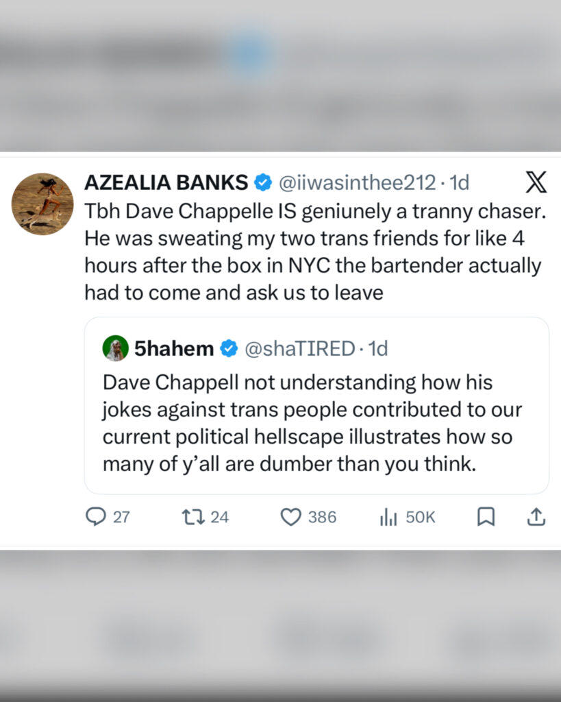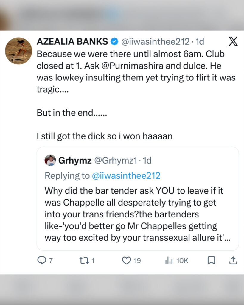 Azealia Banks has social media in a frenzy after making shocking claims about Dave Chappelle on X, formerly known as Twitter.