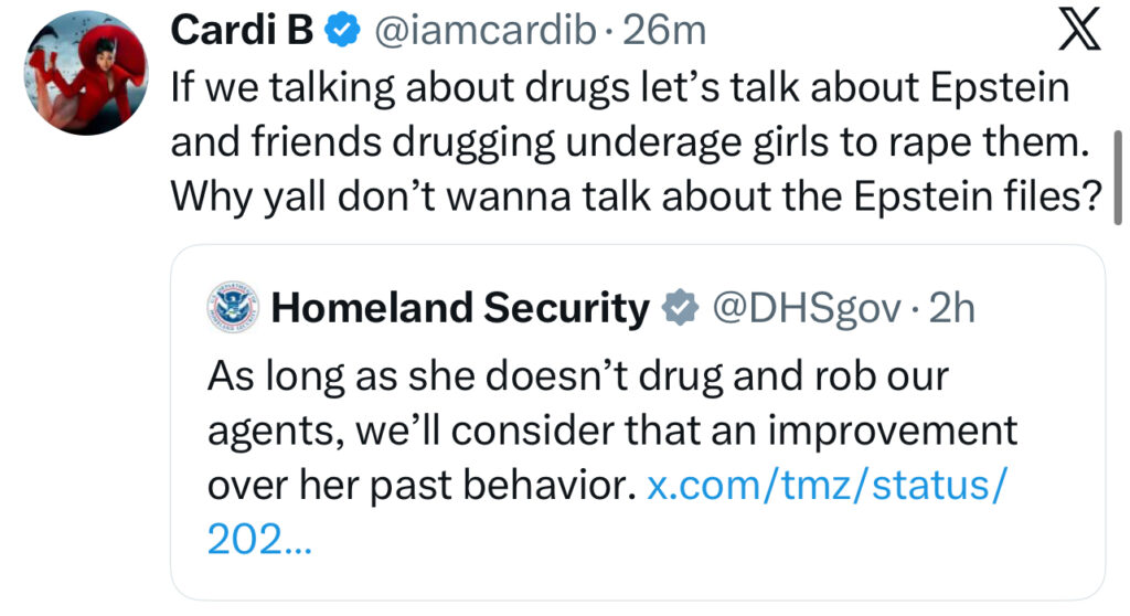 DHS responded via X (formerly Twitter) with a pointed jab referencing Cardi’s past controversy, writing: