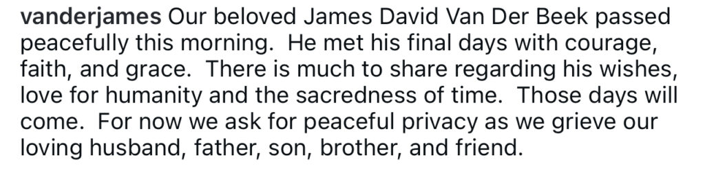 Shortly after the news broke, his wife Kimberley Van Der Beek shared an emotional message on Instagram, saying her husband “met his final days with courage, faith, and grace.” She asked for privacy as their family navigates this devastating loss.