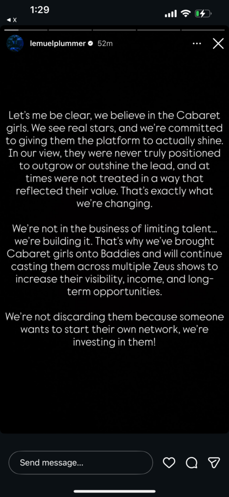According to Lemuel, the network is actually expanding opportunities for the Cabaret stars—placing them on other Zeus shows like Baddies to increase their exposure and income. He pushed back against the idea that anyone is being held back, saying Zeus is focused on “building talent,” not limiting it.