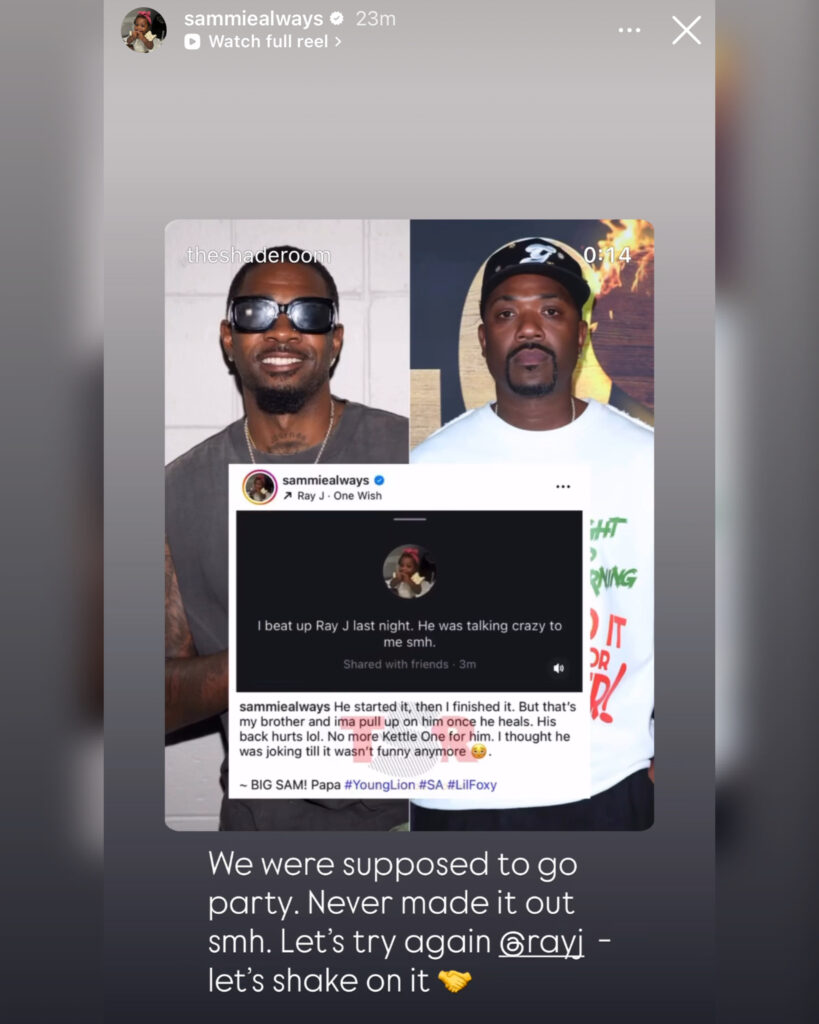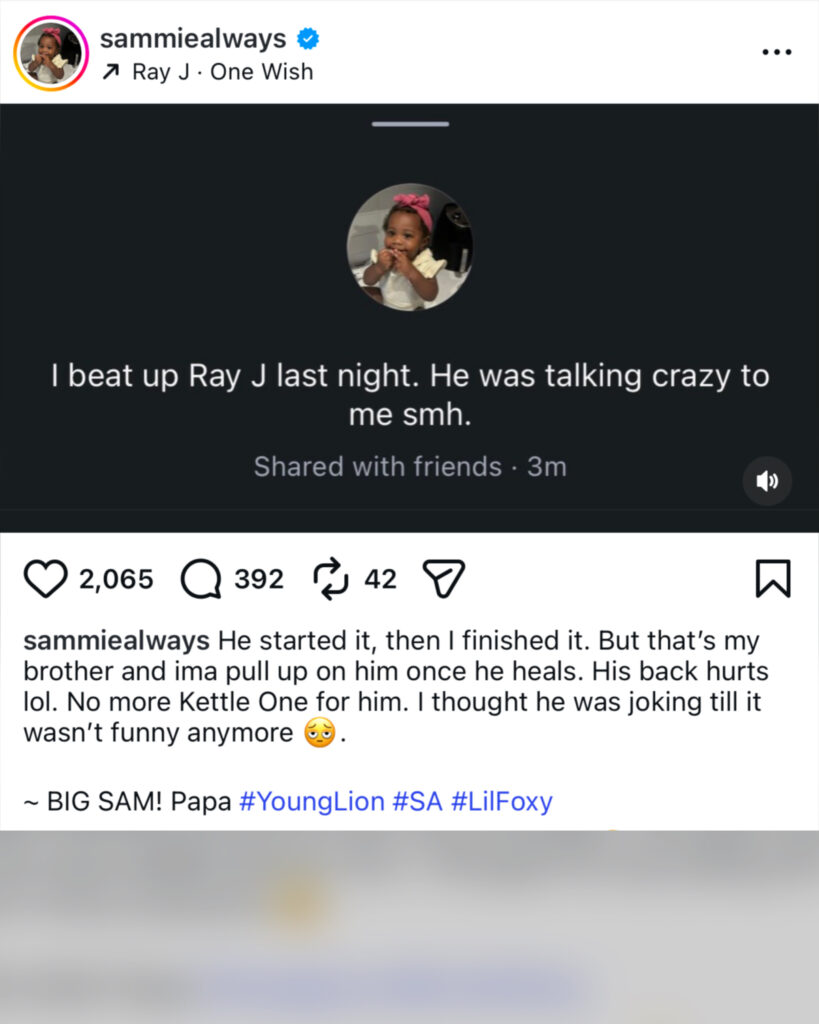 “I beat up Ray J last night. He was talking crazy to me smh. He started it, then I finished it,” Sammie wrote, making it clear he wasn’t looking for trouble—but handled it when it came his way.