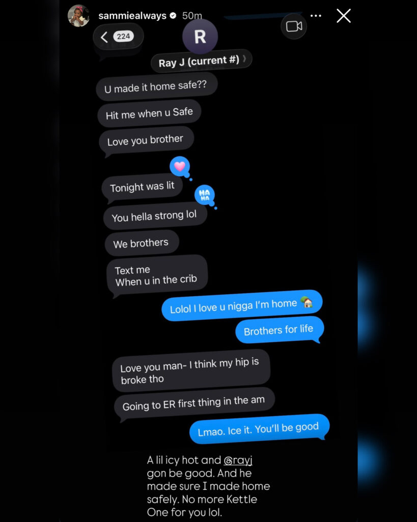 In a positive twist, both artists squashed any tension before the night ended. Sammie later shared text messages showing Ray J checking to make sure he made it home safe. Ray J joked that his hip was “broke” and said he planned to hit the ER in the morning.