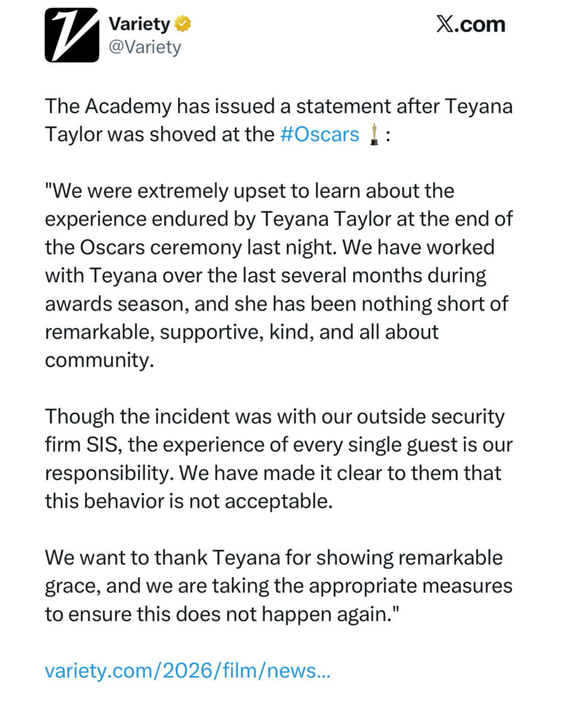 The Academy of Motion Picture Arts and Sciences also responded, making it clear they were disappointed by the incident and emphasizing that guest safety and respect are a priority.