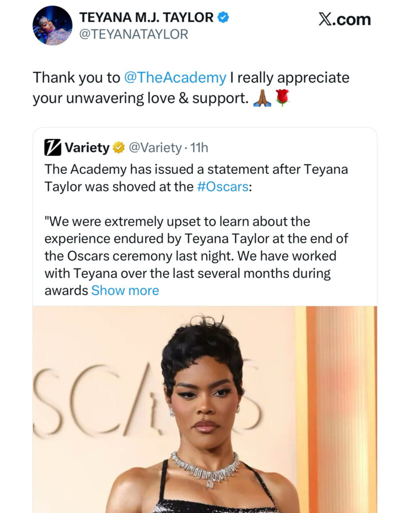 The Academy Has Issued A Statement After Teyana Taylor Was Shoved At The Oscars